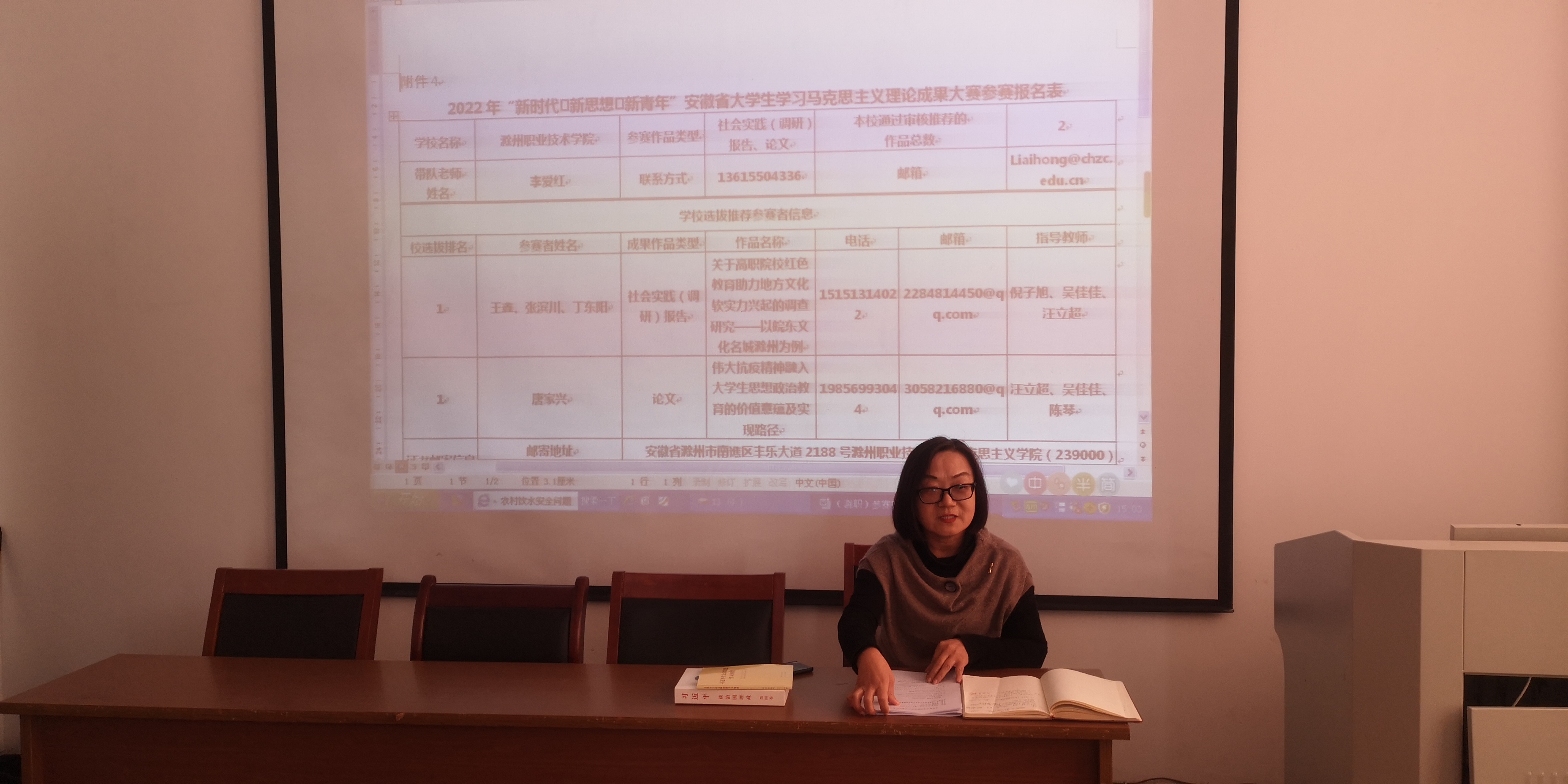 会上,李爱红首先对部门近期开展的教科研、宣讲活动、征文送选、参赛情况等工作进行了通报,重点介绍了本学期《习近平新时代中国特色社会主义思想概论》课程的开设情况,通报了2022年“新时代·新思想·新青年”安徽省大学生学习马克思主义理论成果大赛参赛情况,并对职成教、校级科研课题的申报给予了相关的指导;其次,李爱红传达了9.30教育部“全国高校思政课工作调度会”精神,对调度会上的六点要求进行了具体的解读;最后,副院长孔金布置了教学工作的几点安排和注意事项,强调意识形态的重要性,重点解决思政课堂教学规范的检查监督,切实发挥马院督导组的巡查作用。另外,为了促进马院新进教师更好更快的成长,副教授张家莉老师做了《科研课题申报书的撰写》的主题报告,通过分享自身的科研经历助力青年教师科研启蒙。