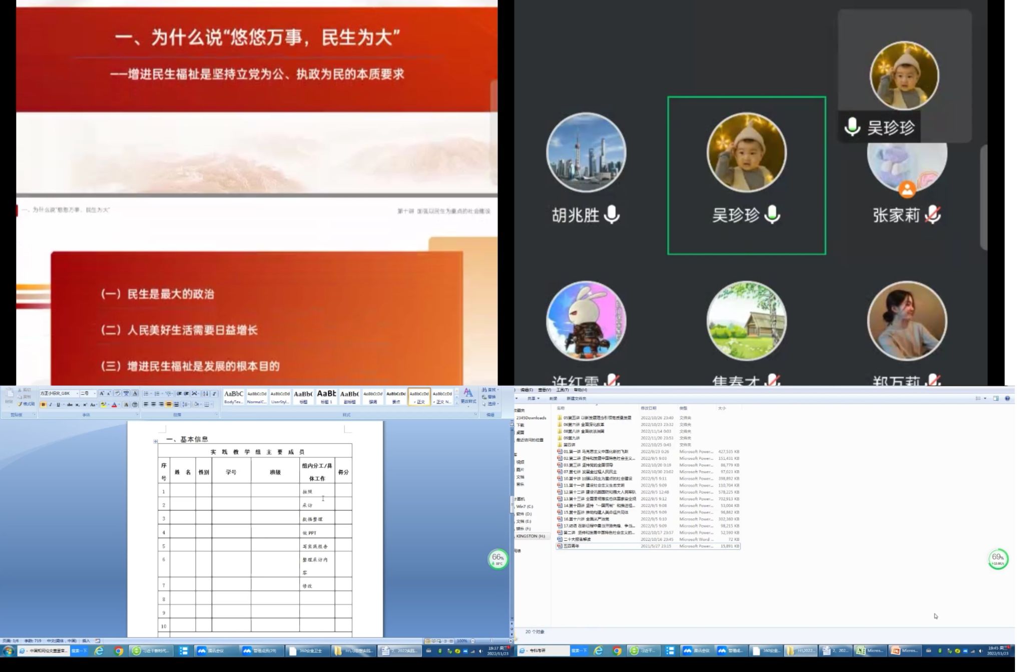 会上,首先胡兆胜副教授和吴珍珍老师分别从不同的角度对第十讲“加强以民生为重点的社会建设”进行了系统性的说课,青年教师代表许红雷发表了自己的教学心得体会,表示在教学过程中还存在着经验不足现象,在后面的教学中要加强区分重难点的辨别能力,将重点内容讲通讲实讲透,注意将时政热点融入到教学中,充分调动学生的课堂参与积极性。其次张家莉对近期教研室工作进行通报,提醒各位老师督促学生及时完成学习通任务点,强调实践教学作业的相关注意事项等。