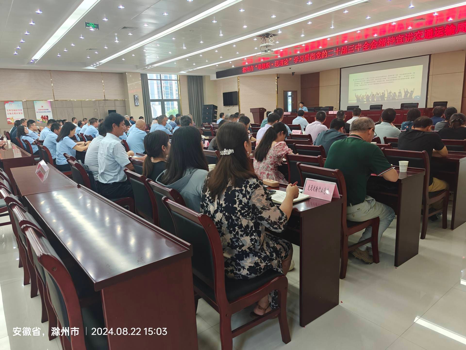 就如何进一步学习贯彻党的二十届三中全会精神,党组书记、局长金同碧结合交通运输工作实际,在讲话中着重强调了三点:一是认真学习,深入领会全会精神;二是实践转化,强化全会精神落地见效;三是立足岗位,做交通系统的担当者作为者。 市交通运输局机关全体成员;市公路管理服务中心、市地方海事(港航)管理服务中心、市道路运输管理服务中心、市交通运输综合行政执法支队、市邮政管理局、市交通建设工程质量监督站、市交通工程检测中心、市交通运输财务管理中心副科级以上干部及各单位联络员;市路桥工程有限责任公司、市城际公交公司领导班子全体成员及各单位联络员;局属各单位离退休党员代表及交通运输行业党委党员代表,共计140余人聆听了宣讲报告。