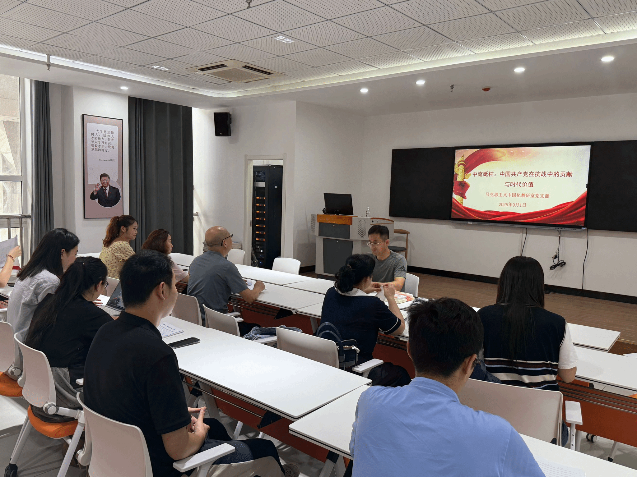 为纪念中国人民抗日战争暨世界反法西斯战争胜利80周年,深入推进党史学习教育常态化长效化,深刻感悟党的历史贡献与精神伟力。9月1日,马克思主义中国化教研室党支部举办“中流砥柱:中国共产党在抗战中的贡献与时代价值”主题党课。本次党课由支部书记汪立超主讲,支部全体党员参加。