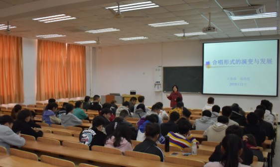 2019年11月12日中午12:10,基础部在南阶101教室举办了“合唱形式的演变与发展”的学术讲座,来自合唱团、艺术团等对合唱感兴趣的同学聆听了此次讲座。讲座由王蓓蓓副教授主讲。