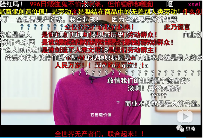 还有一条内容是这样的:他们不只是资本家,他们还要给自己立一个无产阶级的牌坊,对外他是人民富豪,对内他要向社会输出“人才”。一边搞你还得一边让你夸着,美化自己行为,强调正当性,要让人们“快乐”地感受剥削,人们回过神来,才着了味道。很多年轻人并不是彻底的不分历史阶段的否定资本,他们特别反感资本的“又当又立”。而资本大鳄们对此还浑然不觉,继续把资本和公益挂钩,以为这样就能让年轻人忘记资本的本性。这次年轻人连带着对“资本为什么要做公益”,也进行了有力的揭露,弹幕里那句“公益是最好的生意”,已经道破资本公益的本质。之前很多人都看不透的资本积极做公益的动机,但在B站这些年轻人眼里,资本的这点猫腻就像遇到了X射线,比裸奔都更透明。对于一些嗜血的资本来说,慈善的本质是什么?我记得壹基金前秘书长杨鹏说过一句话至为深刻:资本搞慈善的目的是要“清洗企业家脸上的脓和血”。这是杨鹏在他即将担任秘书长的阿拉善SEE基金会第一次发起筹备会议上的发言内容,可以说一语道破资本家做慈善的玄机。而这个热衷于做公益的杨鹏是美国垄断资本精英代言人安•兰德的信奉者,安•兰德是彻底地反对慈善的,反对富人以任何形式将自己的利益分给穷人。杨鹏当然也是反对马克思主义的,但他肯定认真读过马克思,马克思就说过:“资本来到世间,从头到脚,每个毛孔都滴着血和肮脏的东西”。很多资本(非指全部)热衷做公益的目的,透过现象,就是这么一句话的事。用马克思的理论分析问题,一下子就能抓住了公益的本质。