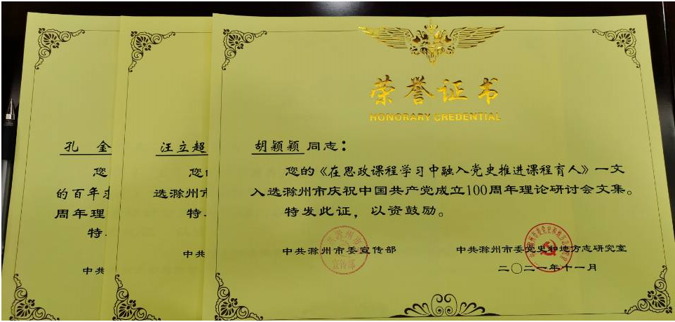 为切实学习贯彻习近平庆祝建党百年的“七一”重要讲话精神,及时学习宣传十九届六中全会精神,11月11日,滁州市委宣传部召开了“滁州市庆祝中国共产党成立100周年理论研讨会”,并颁发了荣誉证书。马克思主义学院三名教师孔金、胡颖颖、汪立超以文受邀参加。