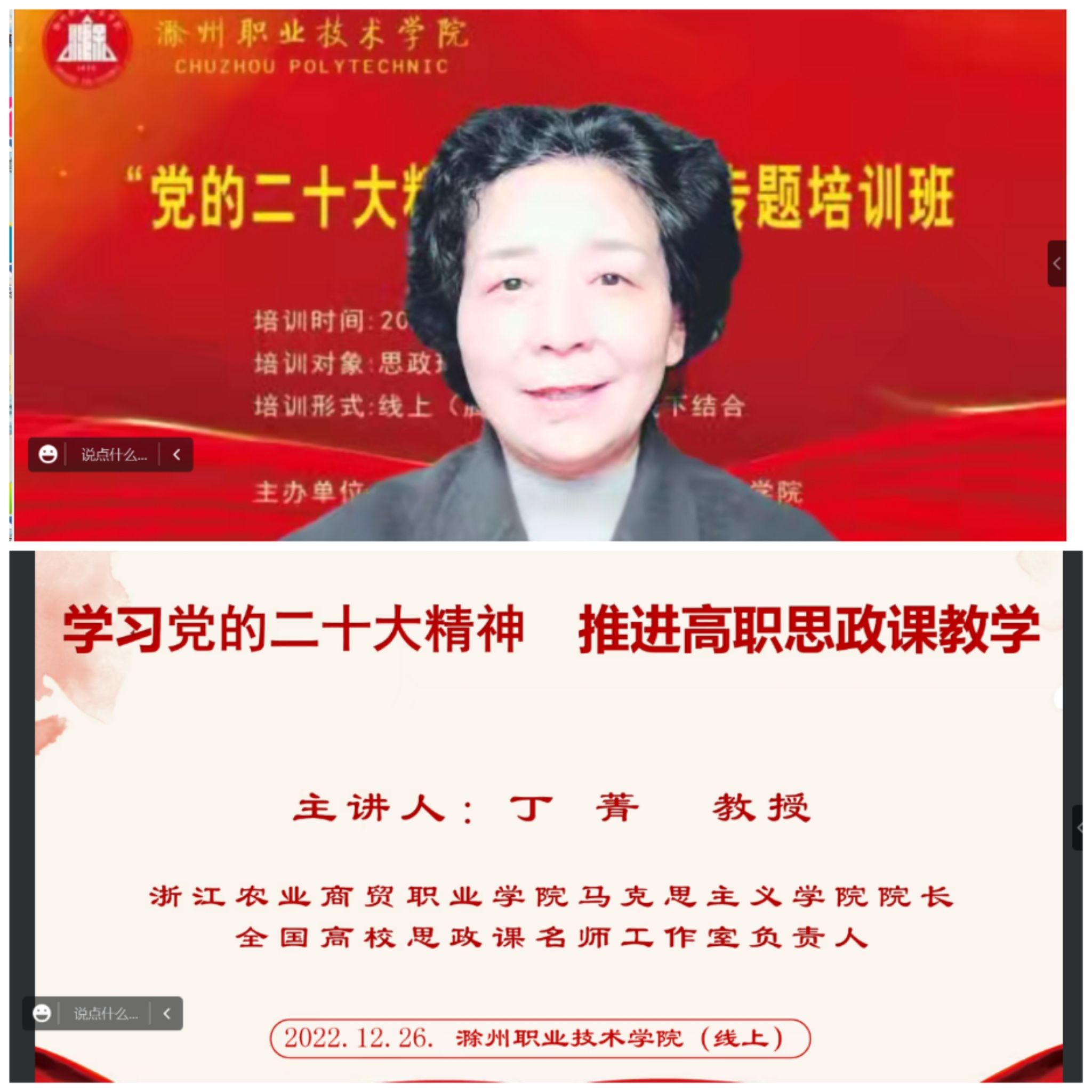 awc777万象城娱乐官网习近平新时代中国特色社会主义思想和党的二十大精神进教材专题培训班正在如火如荼的进行中,12月26日,浙江农业商贸职业学院马克思主义学院院长、教授丁菁受邀做第二场专题辅导《学习党的二十大精神,推进高职思政课教学》,线上会议由马克思主义学院副院长孔金主持,全体专兼职思政教师参加。
