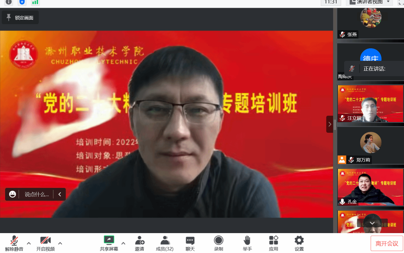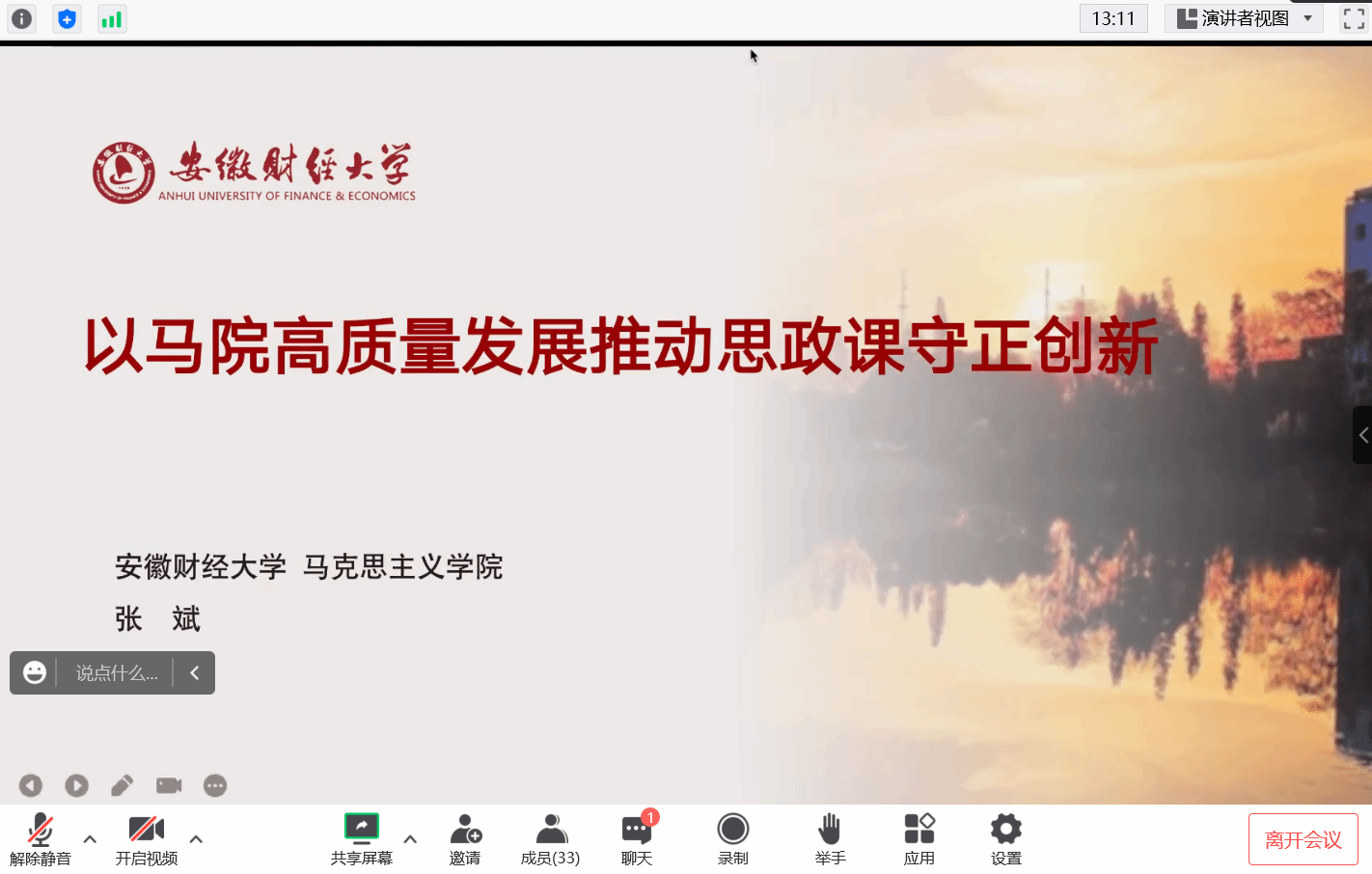 awc777万象城娱乐官网习近平新时代中国特色社会主义思想和党的二十大精神进教材专题培训班正在有序的进行中,12月27日,安徽财经大学马克思主义学院院长、教授张斌受邀做第三场专题辅导《以马院高质量发展推动思政课守正创新》,线上会议由马克思主义学院副院长孔金主持,全体专兼职思政教师参加。