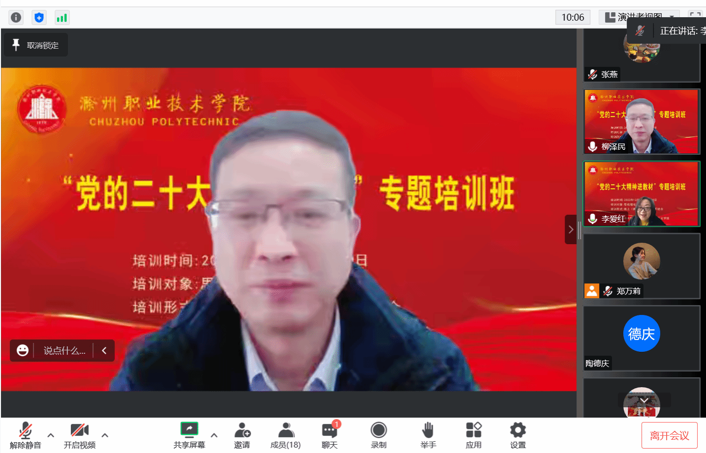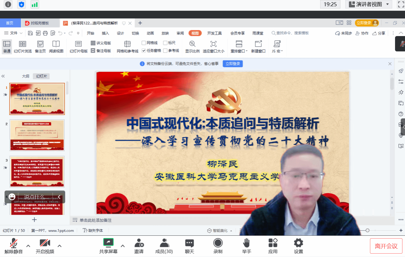 awc777万象城娱乐官网习近平新时代中国特色社会主义思想和党的二十大精神进教材专题培训正在火热开展中,12月28日,安徽医科大学马克思主义学院院长、教授柳泽民受邀做第四场专题辅导《中国式现代化:本质追问与特质解析》,线上会议由马克思主义学院院长李爱红主持,全体专兼职思政教师参加。
