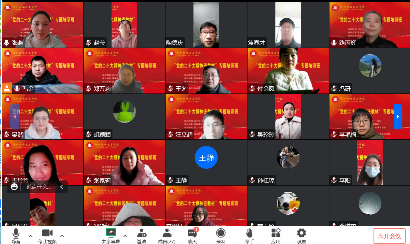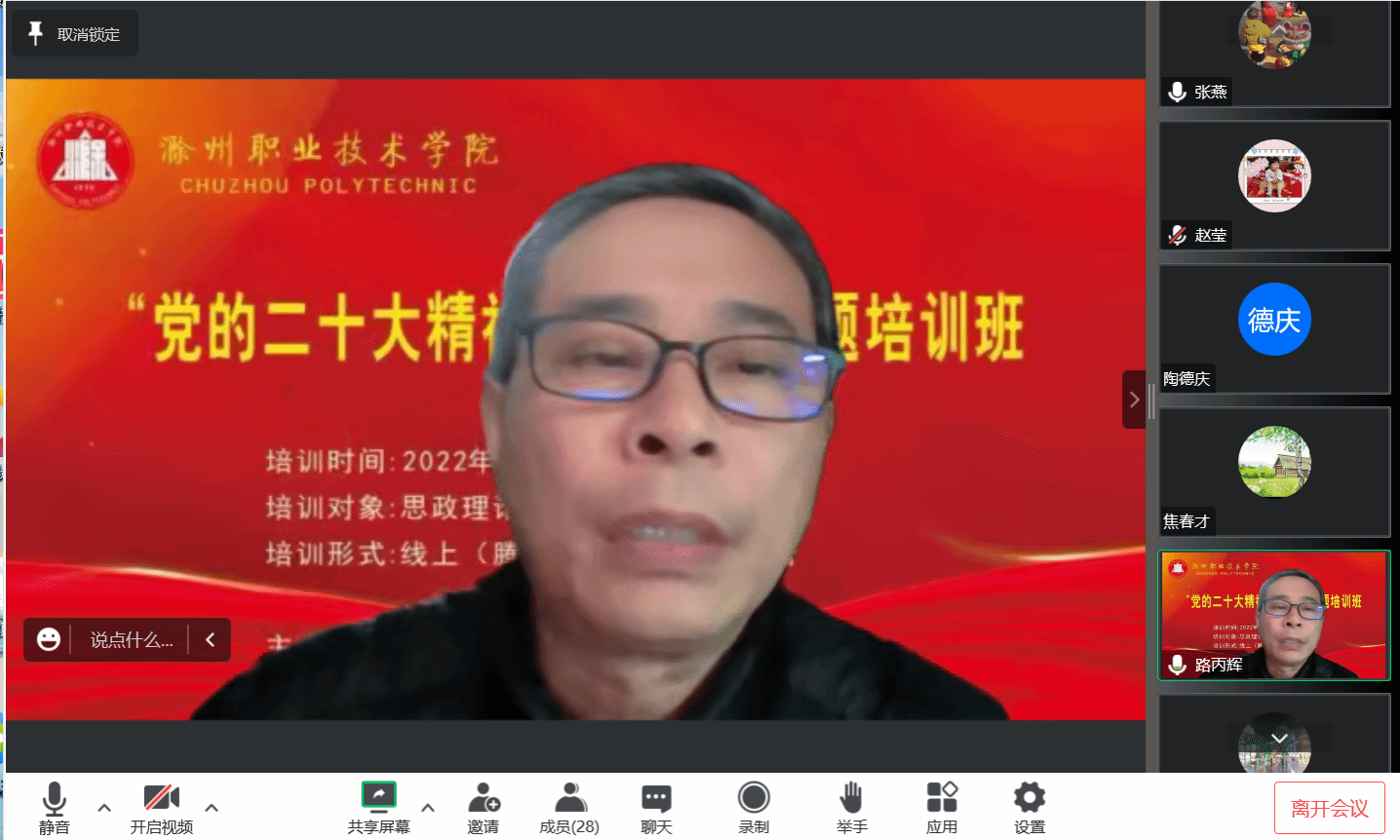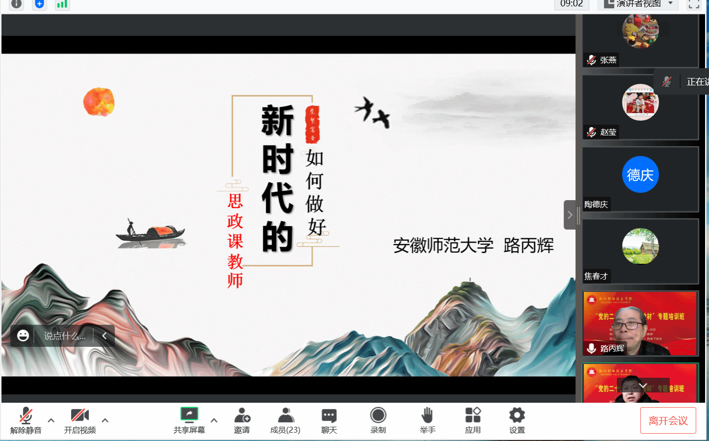 awc777万象城娱乐官网习近平新时代中国特色社会主义思想和党的二十大精神进教材专题培训正在有条不紊的进行中,12月29日下午,党的二十大代表、全国最美思政课教师、安徽师范大学教授路丙辉受邀做第六场专题辅导《如何做好新时代的思政课教师》,线上会议由马克思主义学院副院长孔金主持,全体专兼职思政教师参加。