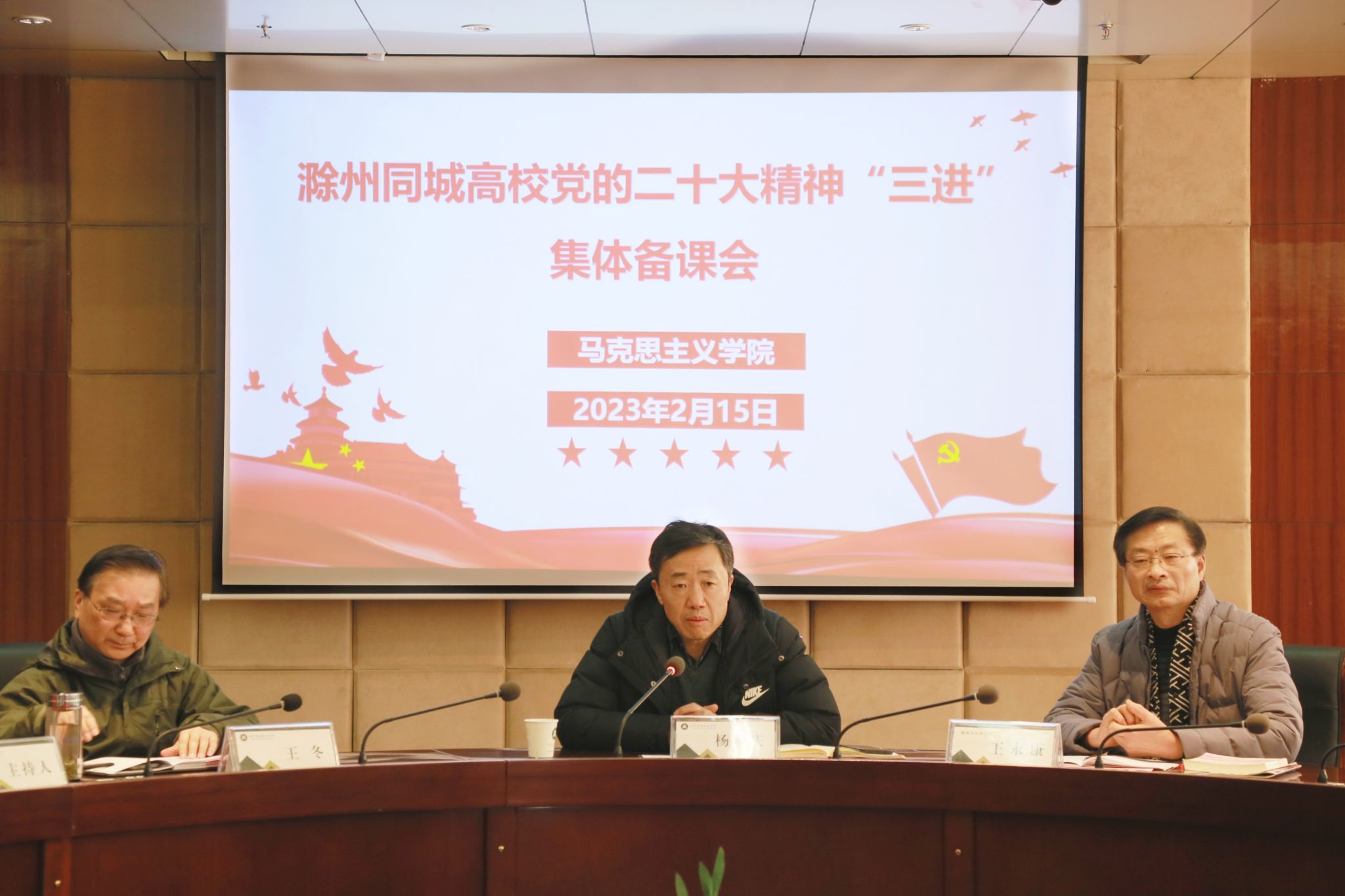 为了帮助思政课教师加深对党的二十大精神的理解和把握,进一步推进将党的二十大精神融入思政课程,2月15日,马克思主义学院牵头组织滁州同城高校党的二十大精神“三进”集体备课会,主题为“中国式现代化理论与实践融入高校思想政治理论课教学”。备课会邀请到滁州市委党校副校长王永康与会梳理点评,滁州学院马克思主义学院党总支副书记、副院长张静、滁州城市职业学院马克思主义学院党总支书记、院长季金年带队参加备课会。awc官网党委副书记杨家庆、党委委员、基础部主任王冬出席会议并讲话。会议由马克思主义学院副院长孔金主持,地点在综合楼1102会议室,同城高校80余名思政课教师与会。