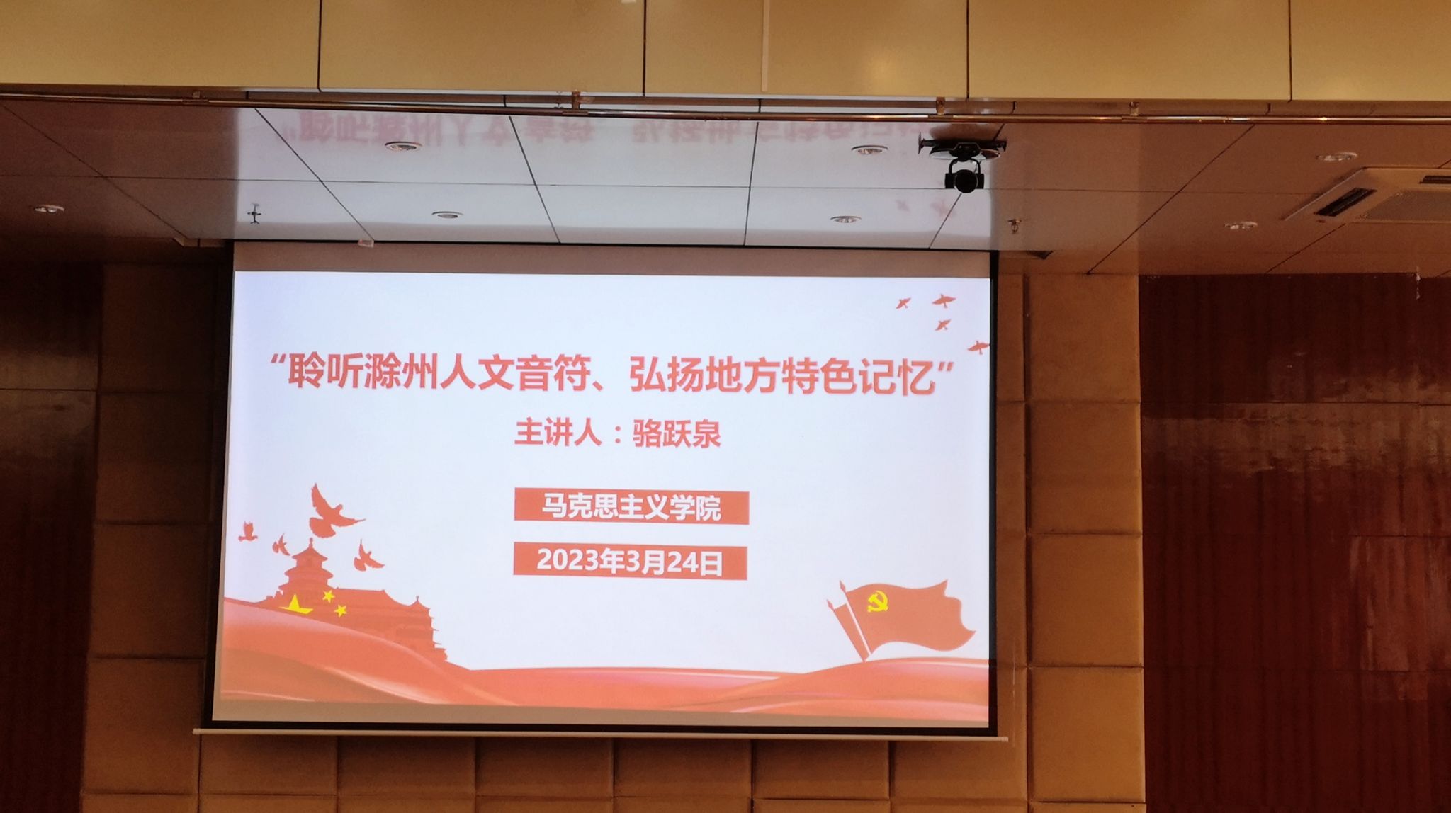 为深入了解滁州文化特色,传承弘扬优秀传统文化,更好的将滁州本土文化融入到思政教学中,3月24日,滁州市地情人文研究会副秘书长、滁州市委党校行政处长骆跃泉受邀来awc官网进行“聆听滁州人文音符 弘扬地方特色记忆”专题讲座,讲座地点设在综合楼1101会议室,讲座由马克思主义学院副院长张家莉主持,全体专兼职思政教师参加。