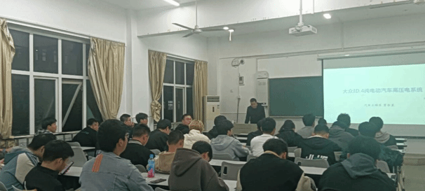 为了丰富学生课外生活,拓展学生专业知识,使学生掌握新能源汽车技术发展新动态,汽车工程系于4月26日晚19:00-20:30在5214教室举办了“大众ID.4纯电动汽车高压电系统”知识讲座,由汽车专业课教师贾会星主讲。