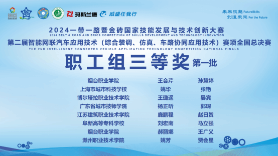 10月30日至11月2日,2024一带一路暨金砖国家技能发展与技术创新大赛第二届智能网联汽车应用技术(综合装调、仿真、车路协同应用技术)赛项全国总决赛在宣城顺利闭幕。我院四名教师在职工组同台竞技,其中杨靖、谢强两位老师获得了二等奖,姚芳、贾会星两位老师获得三等奖的好成绩。