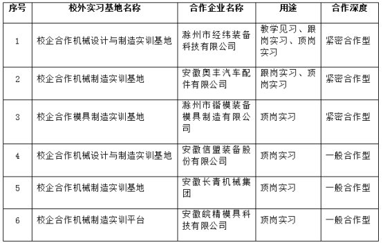 校外实训基地主要集中在滁州本地的多家企业,如滁州市锴模装备模具制造有限公司、安徽信盟装备股份有限公司、安徽长青机械集团、安徽皖精模具科技有限公司等,专业学生在第五学期和第六学期的实习受到实习基地的热烈欢迎。