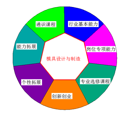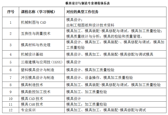 包括:模具材料及热处理、机械设计基础、三维建模与应用技术、模具制造技术、冲压模具设计与制造、塑料模具设计与制造、模具CAM技术、模具CAD技术、模具数控加工技术、模具CAE技术、特种加工技术、模具修配与维修技术、模具钳工工艺学、创新创业教育、工商企业管理。