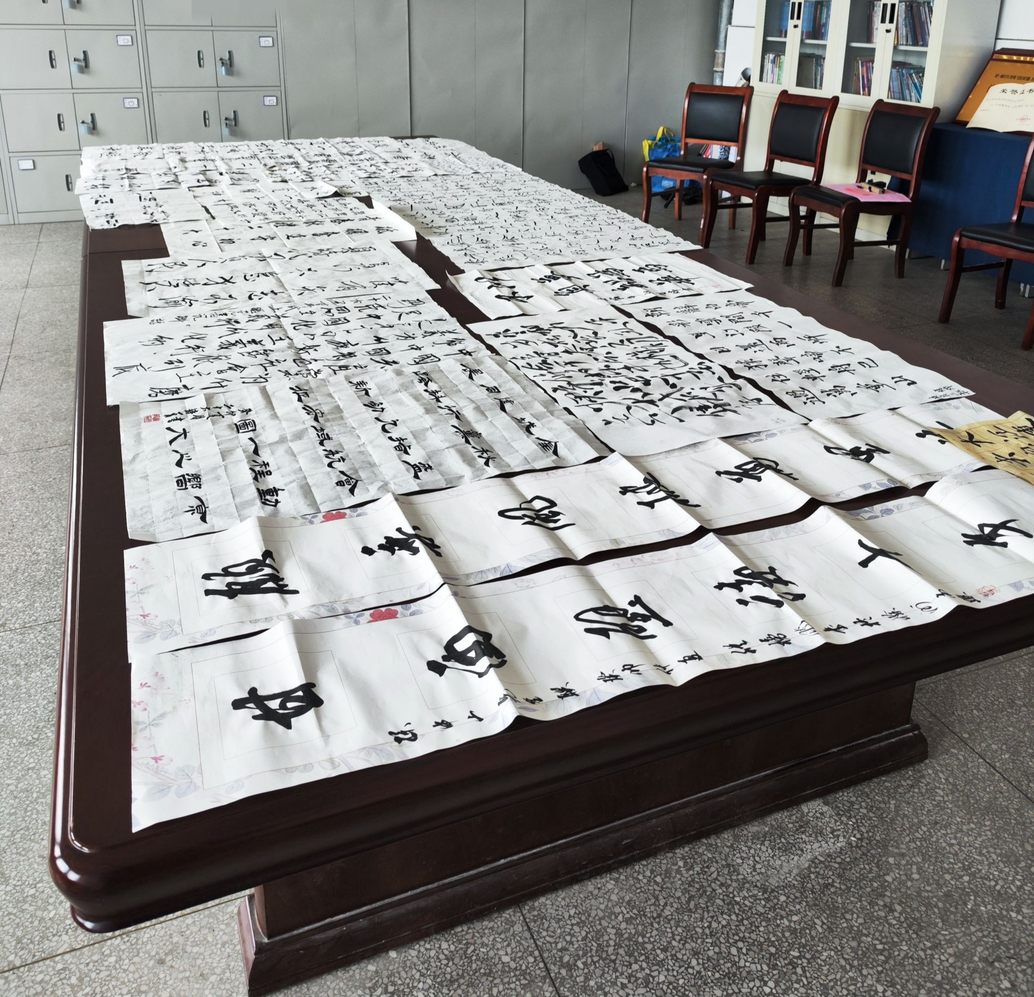 此次参赛作品分为硬笔和软笔两类,软笔有行书、隶书、楷书、草书等等。徐士彬老师对同学们的书法作品一一查看,过程中,他时而驻足停留,仔细端详;时而品评交流,频频称赞,不禁对学校办学水平和学子优良素质给予高度肯定。最后,徐士彬老师对所有作品进行了评选,其中一等奖作品3件,二等奖作品4件,三等奖作品5件。