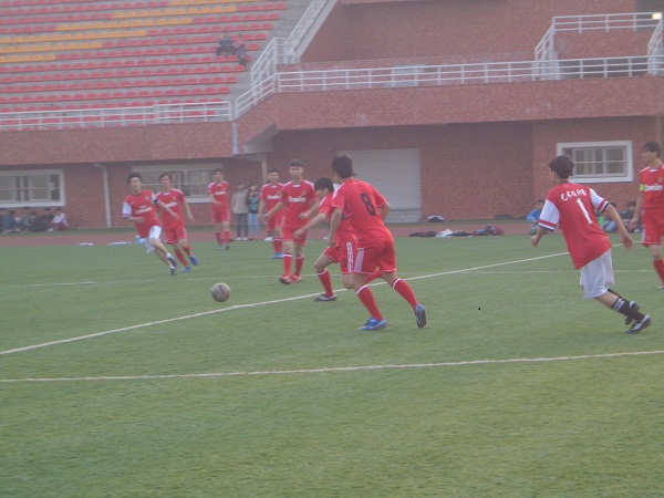 天气微凉但足球场上球员们的热情高涨。随着主裁判一声哨响两队开始了激烈拼抢。开场仅1分钟汽车系队员一次短距射门成功,瞬间点燃了场旁观看助威同学们的热情,使我系球员士气高涨。这也使得汽车系队员在后面的比赛中一直占据着场上的主动,多次将球带到对方球门附近给对方造成了很大威胁。上半场结束在汽车系的球员们完美流畅的配合下取得了2:0的成绩。下半场开始,赛场气氛愈加激烈最终汽车系以6:0的成绩完胜艺术系。