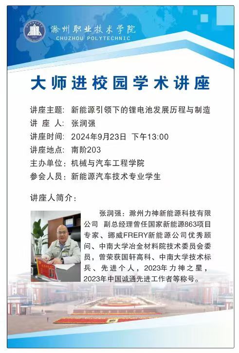 9 月 23 日,机械与汽车工程学院组织“大师进校园”学术讲座,邀请滁州力神新能源科技有限公司副总经理张润强来校,为2024级新能源汽车技术专业的学生开展主题为“新能源引领下的锂电池发展历程与制造”学术讲座。新能源汽车技术专业带头人杨诚、辅导员刘旭冉、全体2024级新能源汽车技术专业学生参加讲座,会议由学院党总支副书记吴佳佳主持。