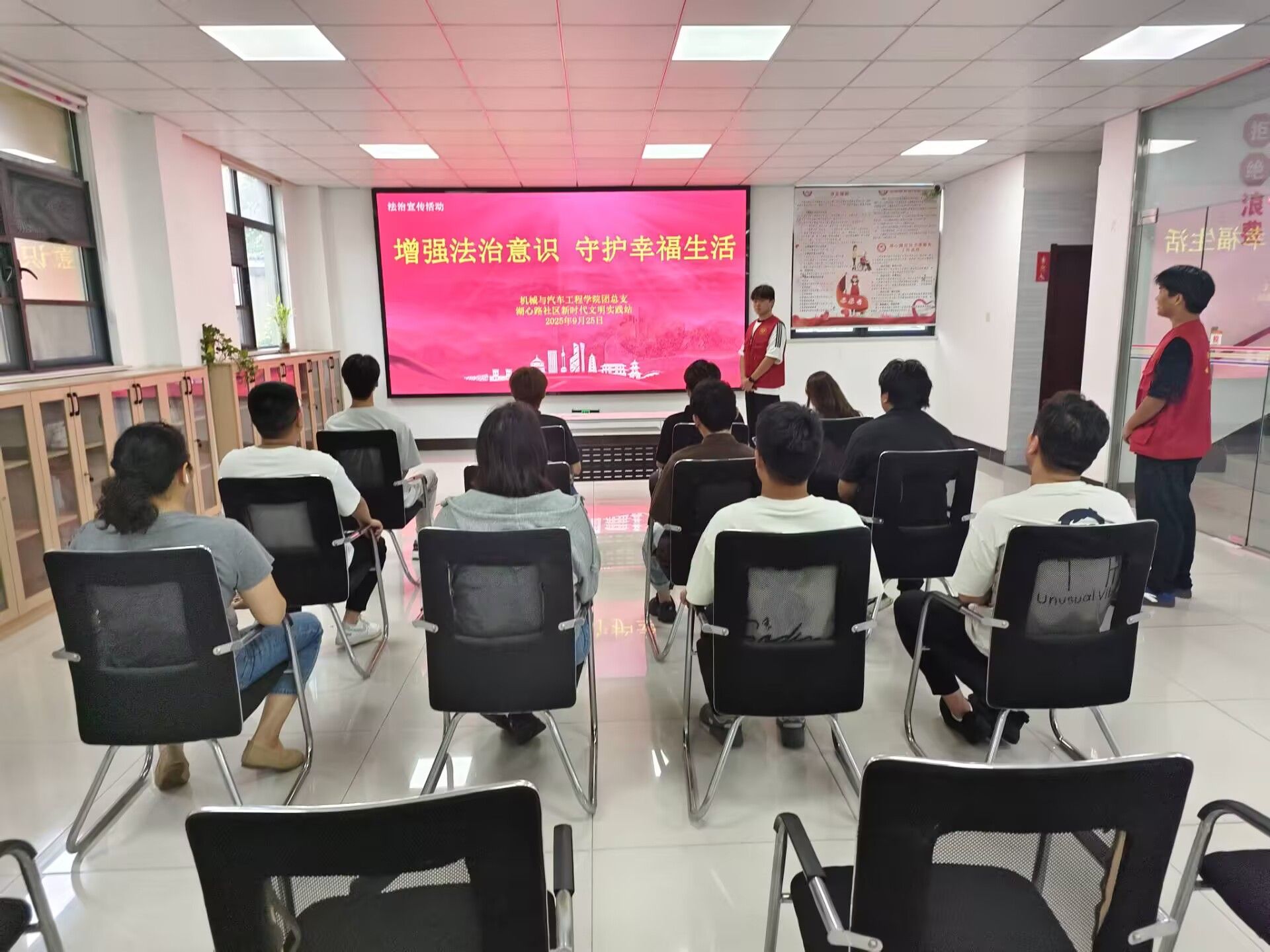 为深入推进法治校园与法治社区协同建设,提升居民法律意识与自我保护能力,9月25日,机械与汽车工程学院团总支志愿者队伍,赴湖心路社区开展“增强法治意识 守护幸福生活”主题宣传活动。