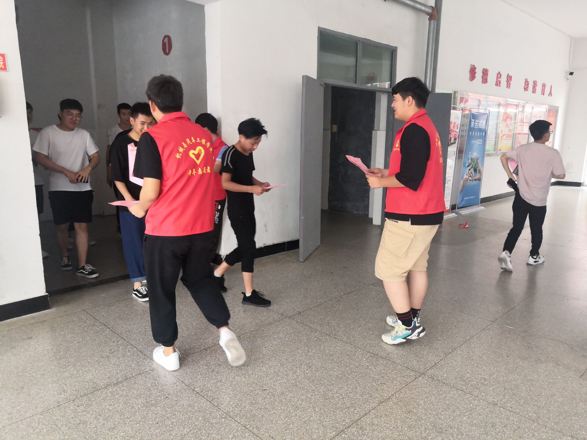 我院青年志愿者分工明确,认真细心,有的在教学楼显眼处拉起印有宣传标语的横幅,有的向路过的同学们发放活动宣传单,并组织志愿者进班发放禁烟倡议书,呼吁大家共创健康无烟校园。