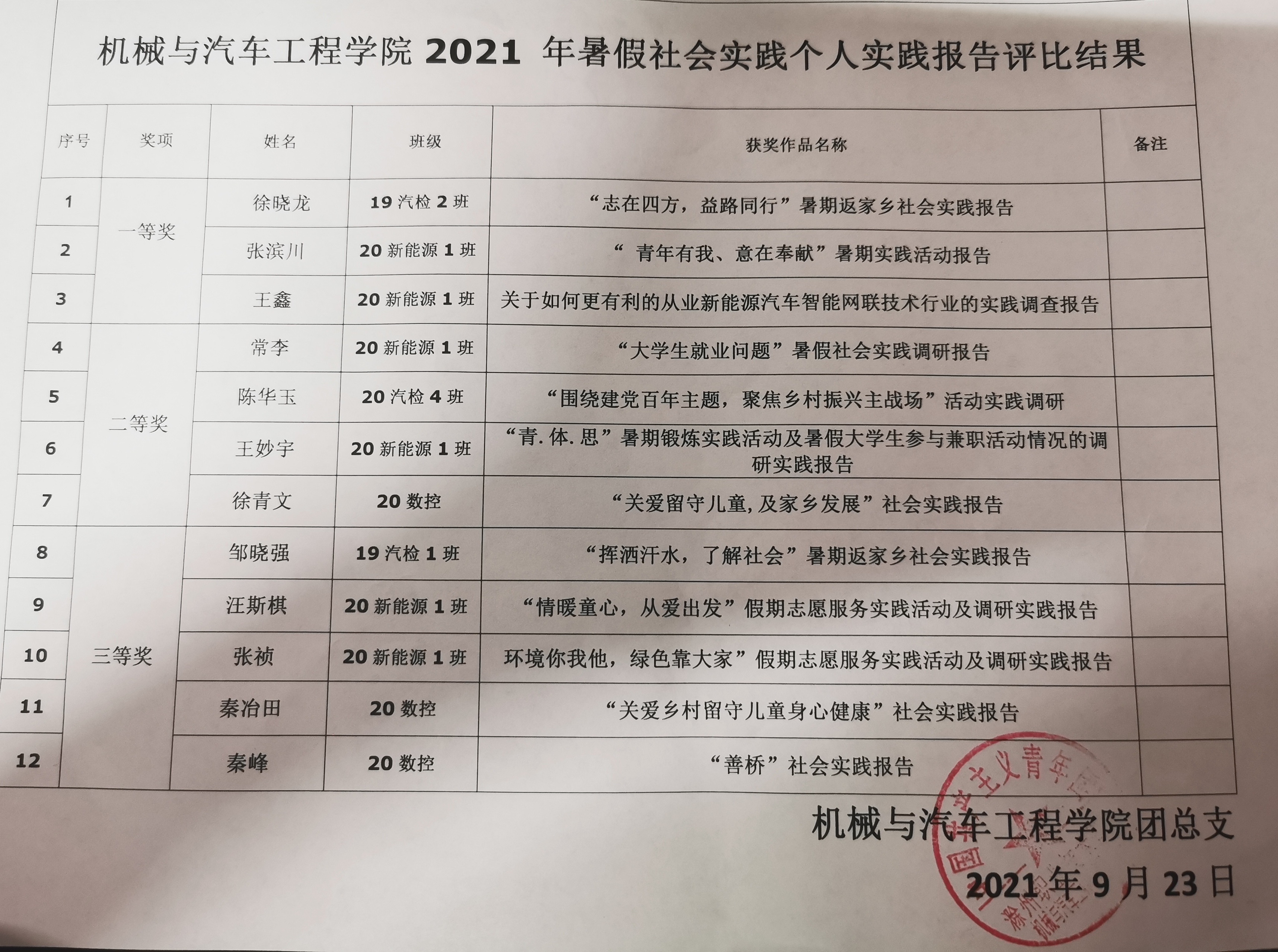 在机械与汽车工程学院团总支的号召下,青年学生在假期以“返家乡社会实践”开展暑假社会实践活动。活动以政务实践、企业实践、公益实践、社区报到、兼职锻炼、文化宣传、网络“云实践”等为主要方式,经过对个人实践报告进行筛选评比,最终徐晓龙、张滨川等12名同学的暑假社会实践报告脱颖而出,评出一等奖3名,二等奖4名,三等奖5名。