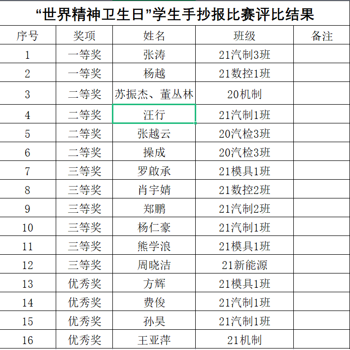 在2021年“世界精神卫生日”来临之际,为进一步提升全院学生的精神卫生意识和心理健康素养,awc777万象城娱乐官网机械与汽车工程学院团总支于2021年10月下旬开展了“世界精神卫生日”手抄报评比活动。