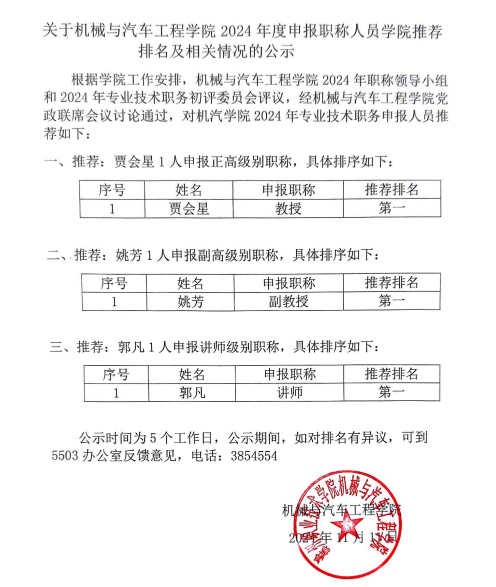 关于机械与汽车工程学院2024年度申报职称人员学院推荐排名及相关情况的公示