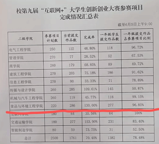 大赛启动以来,食环学院师生积极踊跃报名参赛,精心组织,对照方案内容,做到有重点、分类别、勤督促,在规定时间内圆满完成了220个参赛项目计划,共上传学生创新创业作品286份,完成率130%。教师精心指导学生对项目计划书进行认真打磨,不断提升项目参赛质量,经过专家评审,食环学院学子最终获得金奖8项、银奖10项的优异成绩。