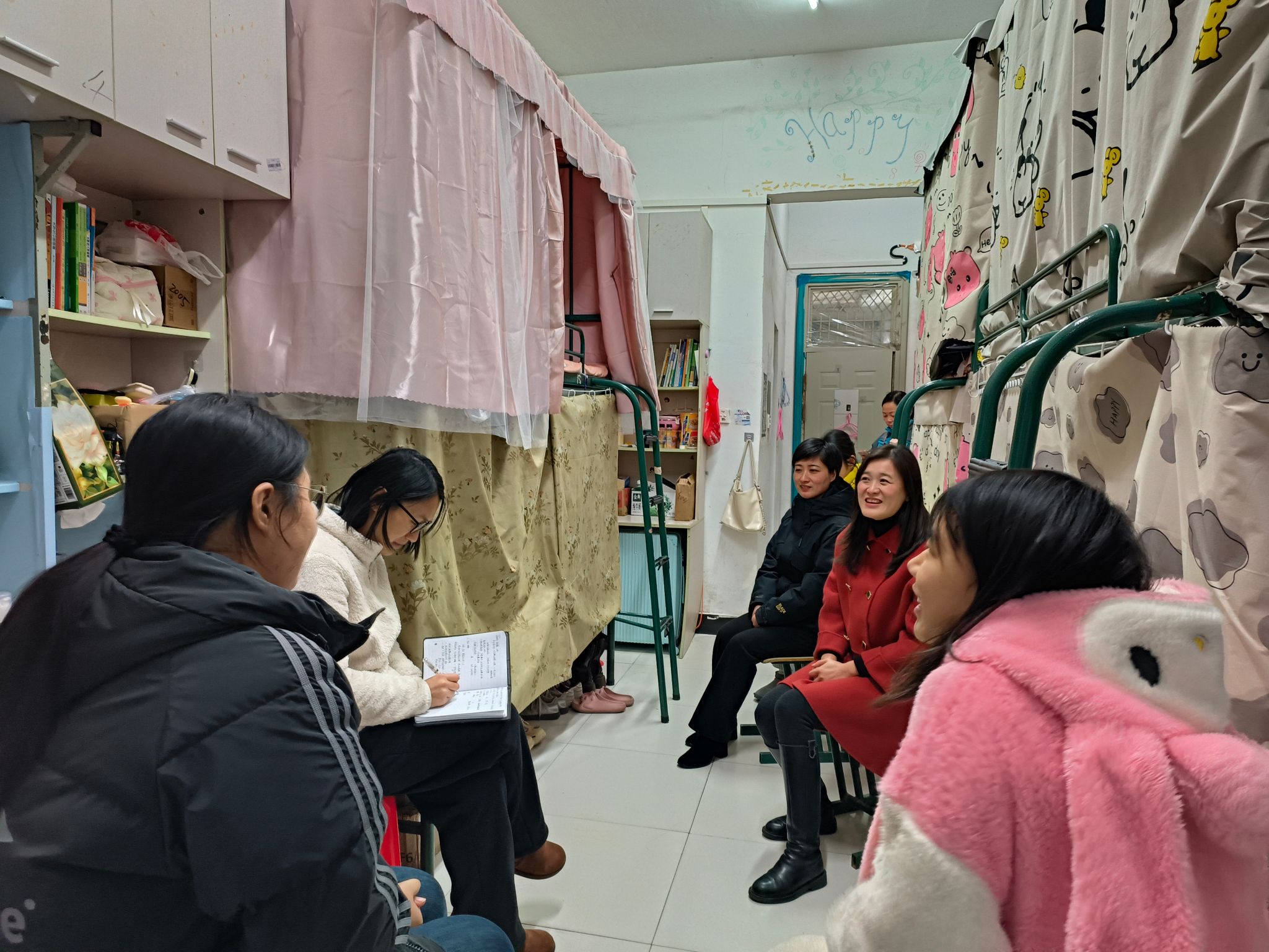 走访中,王宇处长认真查看学生宿舍环境与配套设施。她叮嘱各层长要定期深入学生宿舍,与学生建立常态化联系,及时发现各类问题并妥善解决,切实发挥楼层长的作用,维护校园安全稳定,守护学生身心健康。