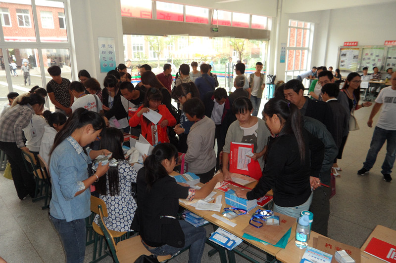 9月7号早上六点多,天空中虽然下着细雨,生化系副书记苏和堂、副主任梁建军就已经到了现场,为学生和家长解答疑难,协调新生报道中出现的各种问题;各教研室安排了骨干教师现场进行专业答疑;现场还安排了家长休息处;小岗村食品公司为新生发放饮料等慰问品。