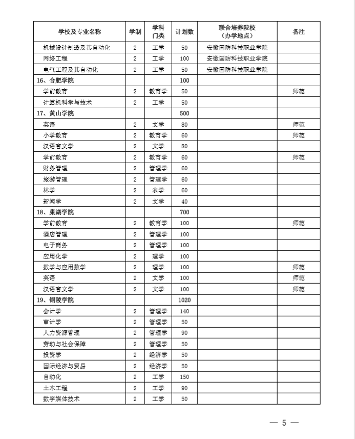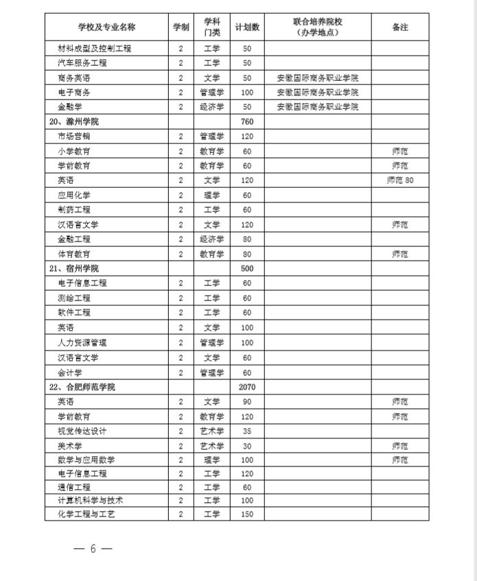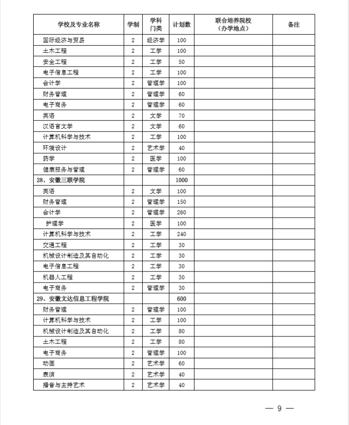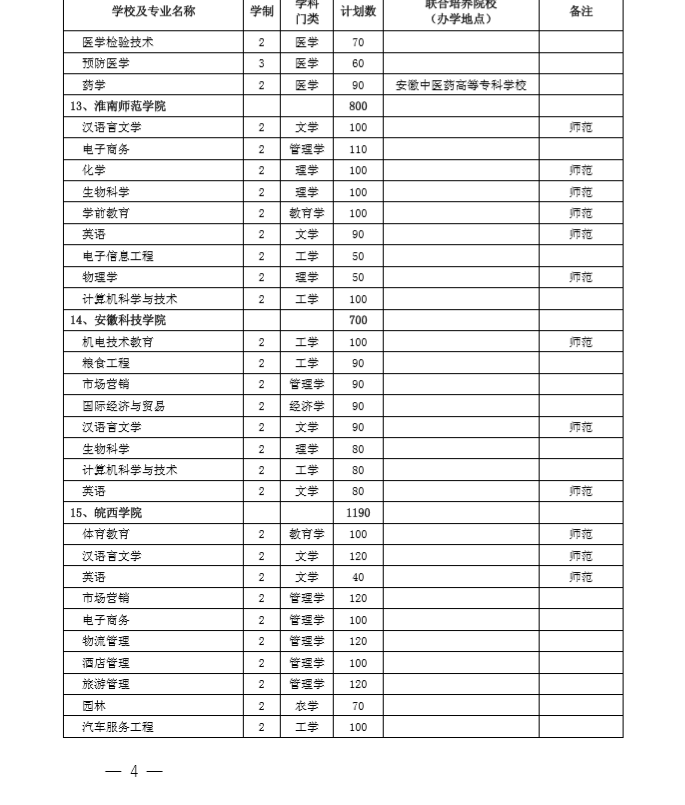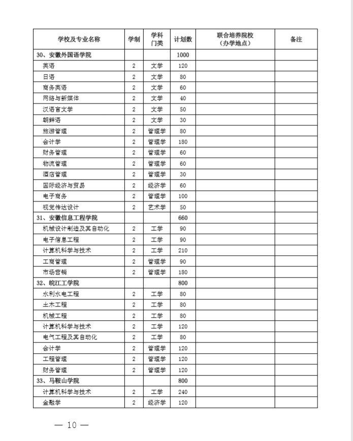 安徽省2020专升本招生计划