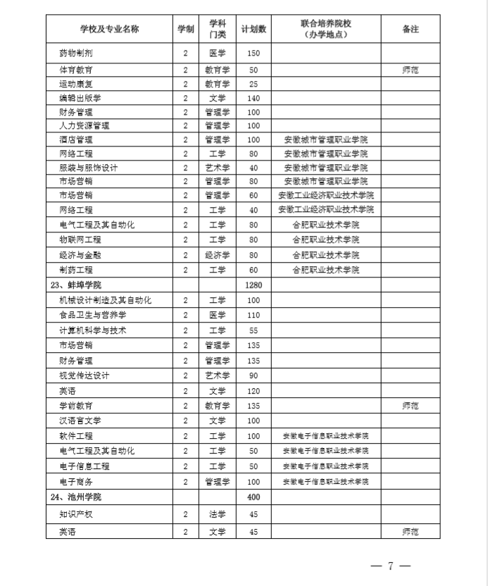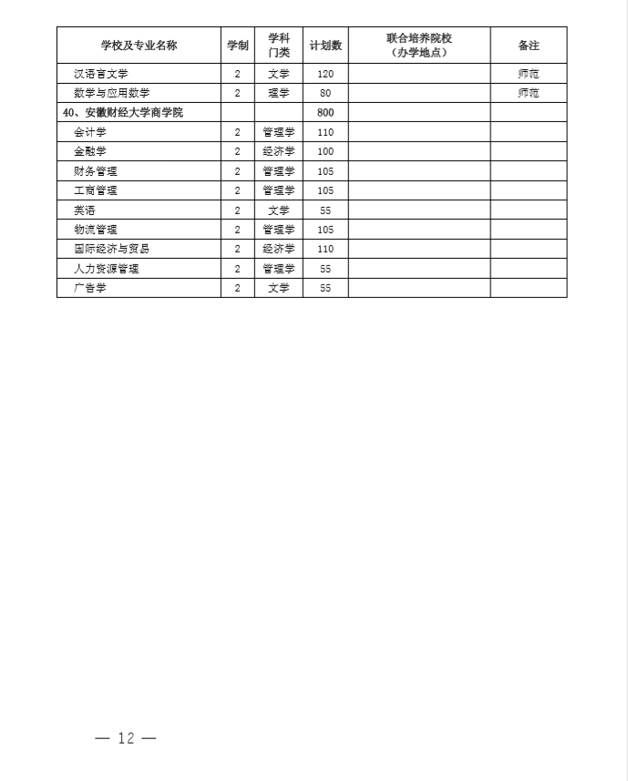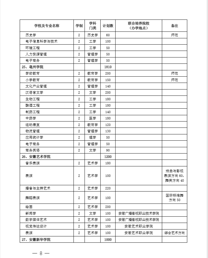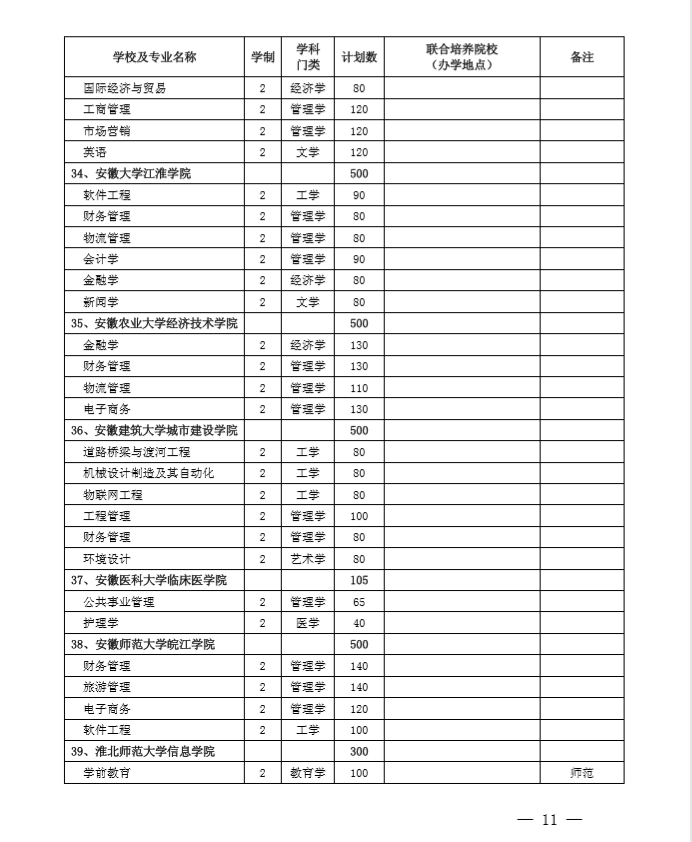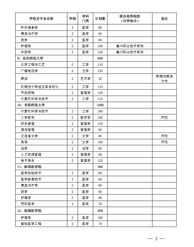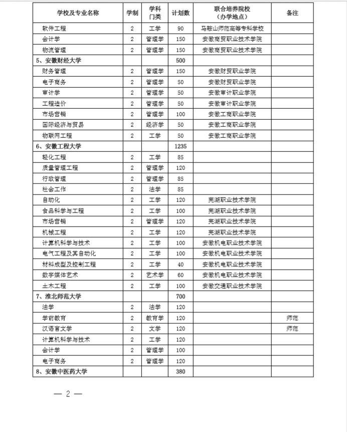 安徽省2020专升本招生计划