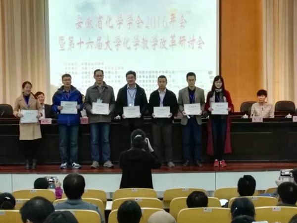 此外,在本次会议中也对2016年安徽省首届普通高等学校大学生化学竞赛获奖学生及指导老师进行了现场颁奖,安徽省首届普通高等学校大学生化学竞赛是由由安徽省教育厅主办,安徽省化学会和安徽省高等学校化学化工实验教学中心联席会协办,安徽师范大学承办的安徽省首届普通高等学校大学生化学竞赛,于2016年10月14至16日在芜湖市举办。比赛中,我院参赛选手与来自于包括中国科学技术大学、安徽大学在内的省内普通本科院校和高等职业院校选手同台比拼,丝毫没有胆怯,表现优异,最终获得省级二等奖2项、三等奖3项,成功展示了我院学子的实力,在全省同类院校中位居前列。
