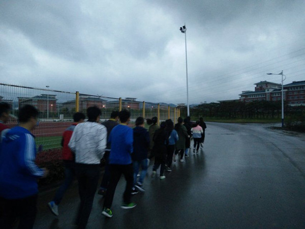 每天早上六点二十,在相关部门的组织下,晨练在学院运动场井然有序进行。同学们步伐坚定、口号响亮,即使遇到降温、刮风、下雨等不利天气,也都努力坚持,相互鼓励。