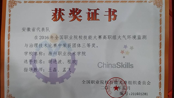 从天津传来消息,在刚刚结束的全国职业院校技能大赛“大气环境监测与治理技术”赛项角逐中,代表安徽省参加竞赛的食品系胡进波、程欢2位同学获得了“三等奖”的好成绩,可喜可贺。