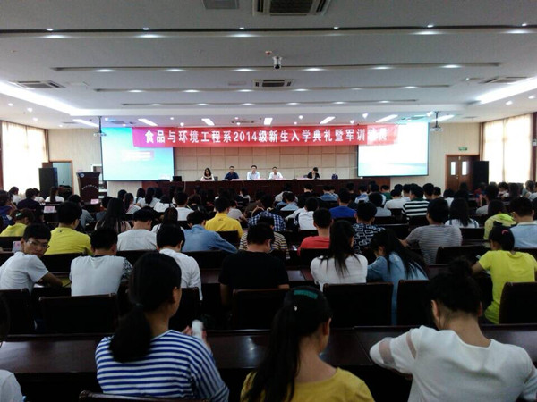 9月15日下午,食品与环境工程系2014级新生入学典礼暨军训动员大会在综合楼5楼报告厅隆重召开,系党总支书记陈震、系主任梁建军、新生班辅导员杨海燕、刘杰与来自全省各地的220名新生齐聚一堂。