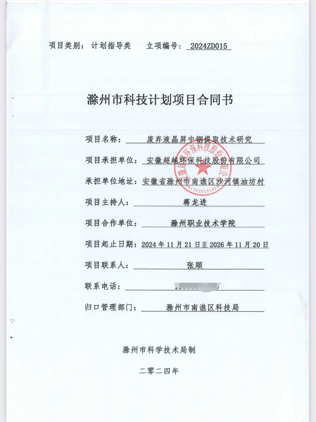 近日,滁州市科学技术局公布了2024年滁州市科技计划项目(农村与社会发展领域)评审结果,由食品与环境工程学院应用化工系和安徽超越环保科技股份有限公司联合申报的计划指导类项目《废弃液晶屏中铟提取技术研究》获批立项。本项目通过引入更为环保的化学处理方法和高效的分离技术,致力于提高铟的回收率,还将为其他电子废弃物中的稀有金属回收提供新技术路径,进一步拓展应用前景。
