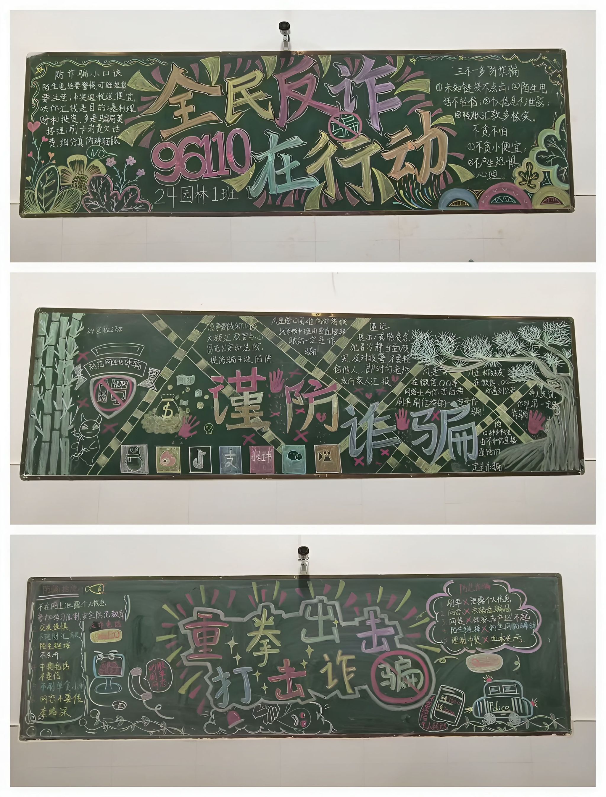 活动中,各班紧扣当前高发的诈骗类型,如网络刷单、冒充公检法、交友诈骗等内容,详细介绍防骗技巧和应对方法,提供真实案例分析。他们用彩色的粉笔勾画出一幅幅排版美观、色彩鲜明的黑板报,出色地完成了此次活动。