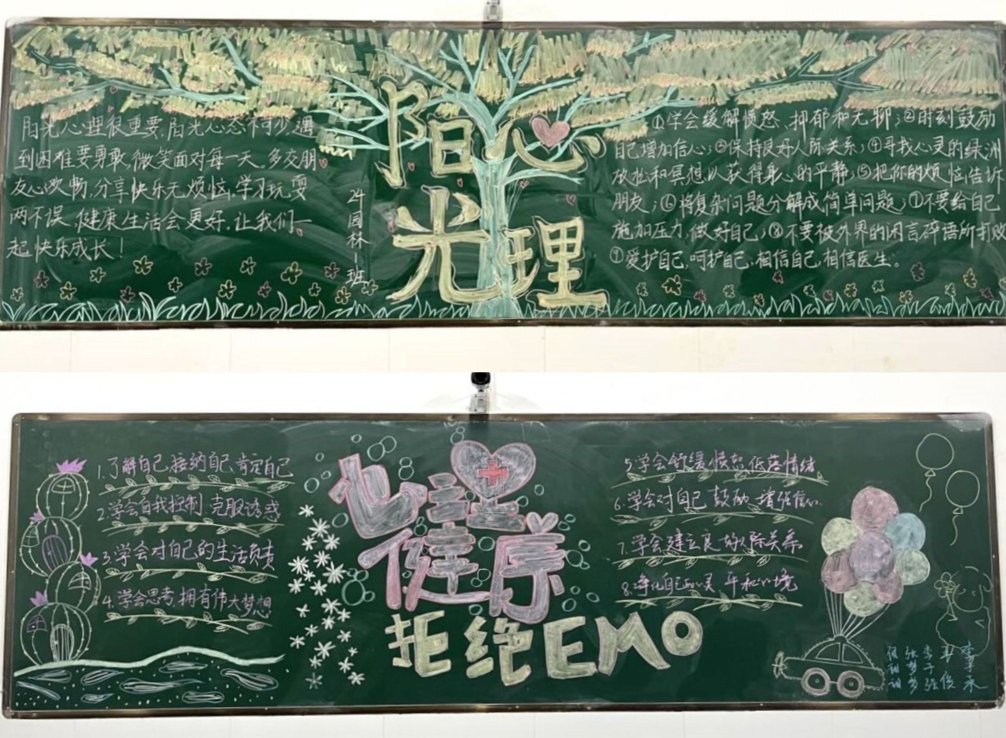 以乐绘“心”图为主题的黑板报活动同步开展,各班学生发挥奇思妙想,用缤纷色彩和生动文字打造心灵阵地。学生们在素材的收集、板报的绘制中,更好地了解了心理健康知识,增强了动手能力与合作精神。一幅幅充满创意的黑板报不仅美化了班级环境,更成为心理健康知识的宣传窗口,营造出“人人关注心理,处处传递温暖”的班级氛围。