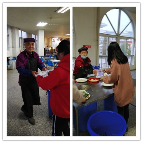 活动一开始,同学们便积极地行动起来,他们在学校食堂的各餐具收集处向食堂工人热情的介绍本次志愿活动的目的,并将橡胶手套送到每一位清洁工人手中。食堂大爷大妈向志愿者表示深深地感谢,一致称赞我系志愿者助人为乐、关爱他人。