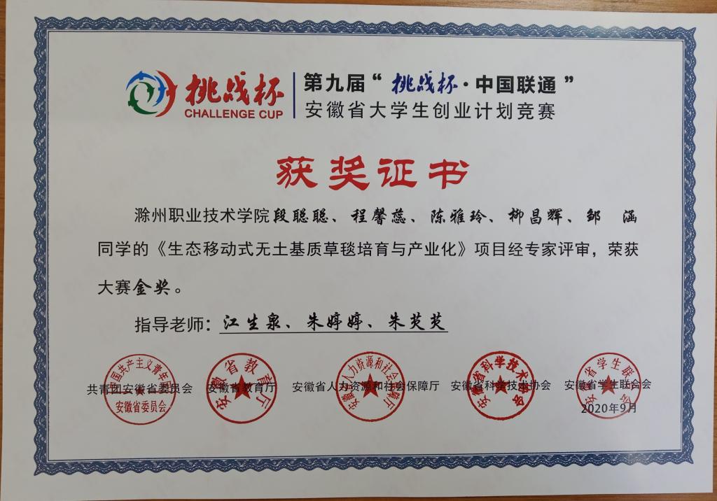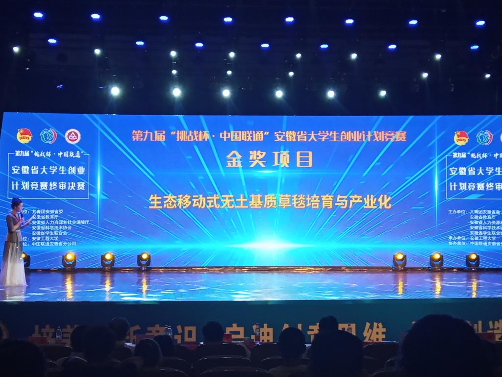 9月5日至7日,第九届“挑战杯.中国联通”安徽省大学生创业计划竞赛终审决赛在安徽工程大学隆重举行。awc官网食品与环境工程学院18园林2班段聪聪、程馨蕊、陈雅玲、柳昌辉、邹涵同学的“生态移动式无土基质草毯培育及产业化项目”经过校赛、省赛初赛及终审决赛多轮紧张角逐,最终荣获大赛金奖,并顺利晋级国赛。该金奖也是生态环保和可持续发展组别中唯一获金奖的高职院校,其项目产品也受到评委专家及领导的充分肯定。