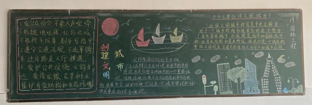 为积极响应文明创城和文明高校创建号召,进一步做好我院班级文化建设和精神文明建设,食环学院团总支于9月21日开展以“文明创建”为主题的黑板报评比活动,18级和19级各班参与了此次板报出制活动。