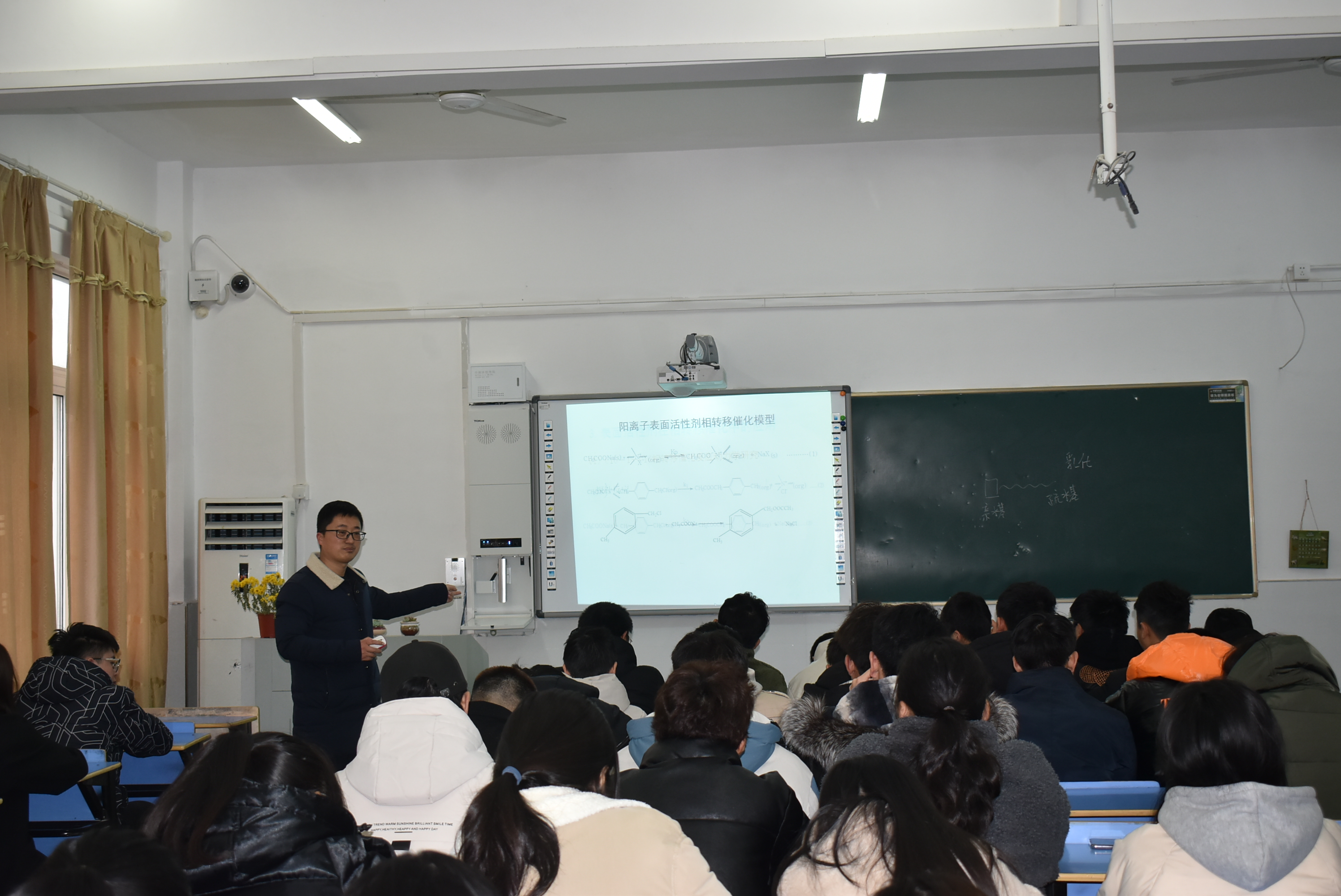 12月9日下午,食环学院在2304教室举办了一场题为《碳酸酯阳离子Gemini表面活性剂的合成及应用》的讲座,应用化工系王磊副教授主讲,应用化工技术、环境工程技术、食品营养与检测等专业的学生及部分教师听取了报告。