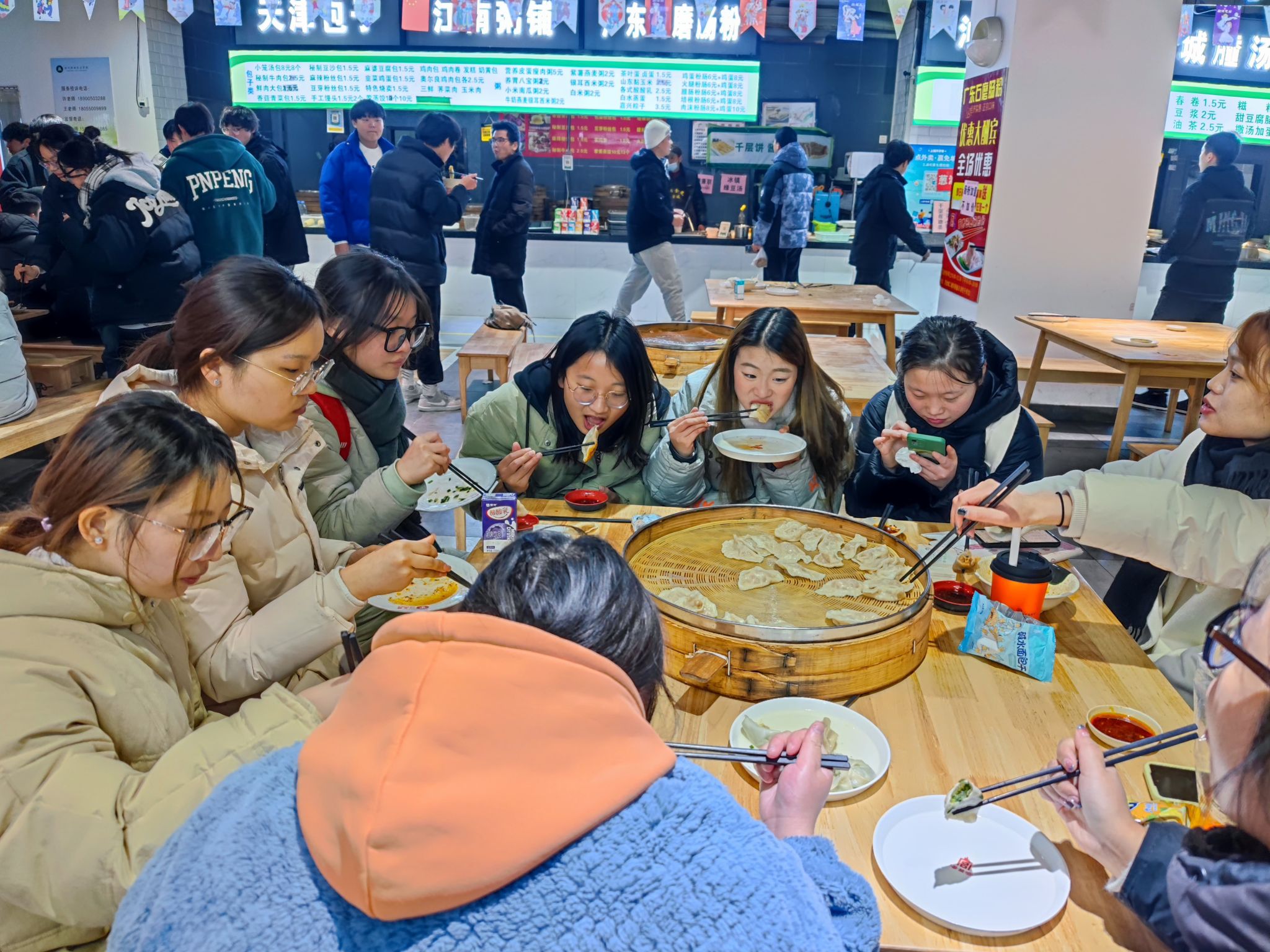 老师和同学们认真做好准备工作,互相传授包饺子的经验,边包饺子边聊天,热情高涨,各展所长,个个动作娴熟。同学们一手拿起饺子皮,一手填馅,双手合拢一捏,一个个形态各异的饺子就成型了,一双双灵巧的手把浓浓的冬至情通通包进了圆鼓鼓的饺子里。在包饺子的间隙中,水也烧开了,一个个大小不一却显得憨态可掬的饺子排排队进入了滚烫的水中,不一会便翻着白肚皮浮在水上。随后,一盘盘冒着热气的饺子便端上了桌,在零下10度的冬至日,在饺子的热气氤氲下,天气似乎都没那么冷了。