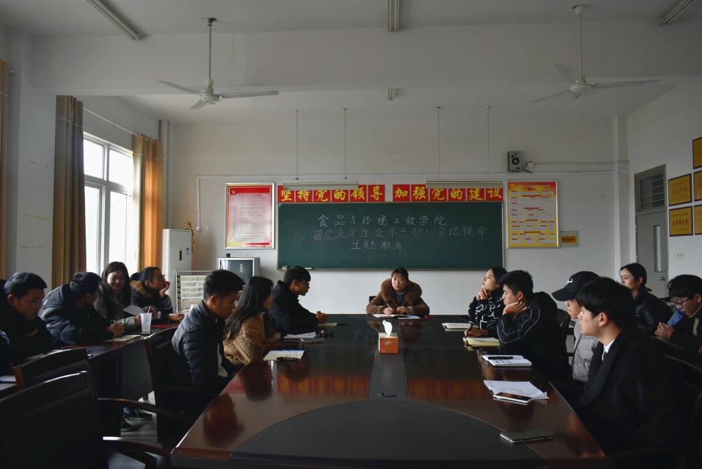 为深入开展“不忘初心、牢记使命”主题教育,充分发挥团学骨干助手和后备军的模范带头作用,食环学院团总支学生会在学院党总支的指导下,于12月19日中午在2317室开展“不忘初心、牢记使命”主题教育。会议由食环学院团总支指导老师李瑞瑞主持,团总支学生会主要学生干部参加了学习会。