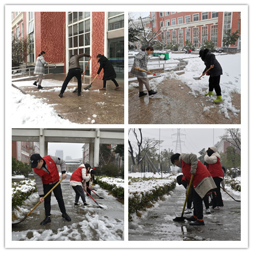 我院吴剑安等党员教师、田志强等入党积极分子不畏严寒,拿起铁锹、扫帚等工具,大家相互配合、齐心协力,经过两个多小时的奋力打扫,终于将致善楼门口的积雪以及从致善楼至食堂的积雪全部清理。为老师和参加技能大赛集训的学生打通了安全通道,确保了大家的出行安全。