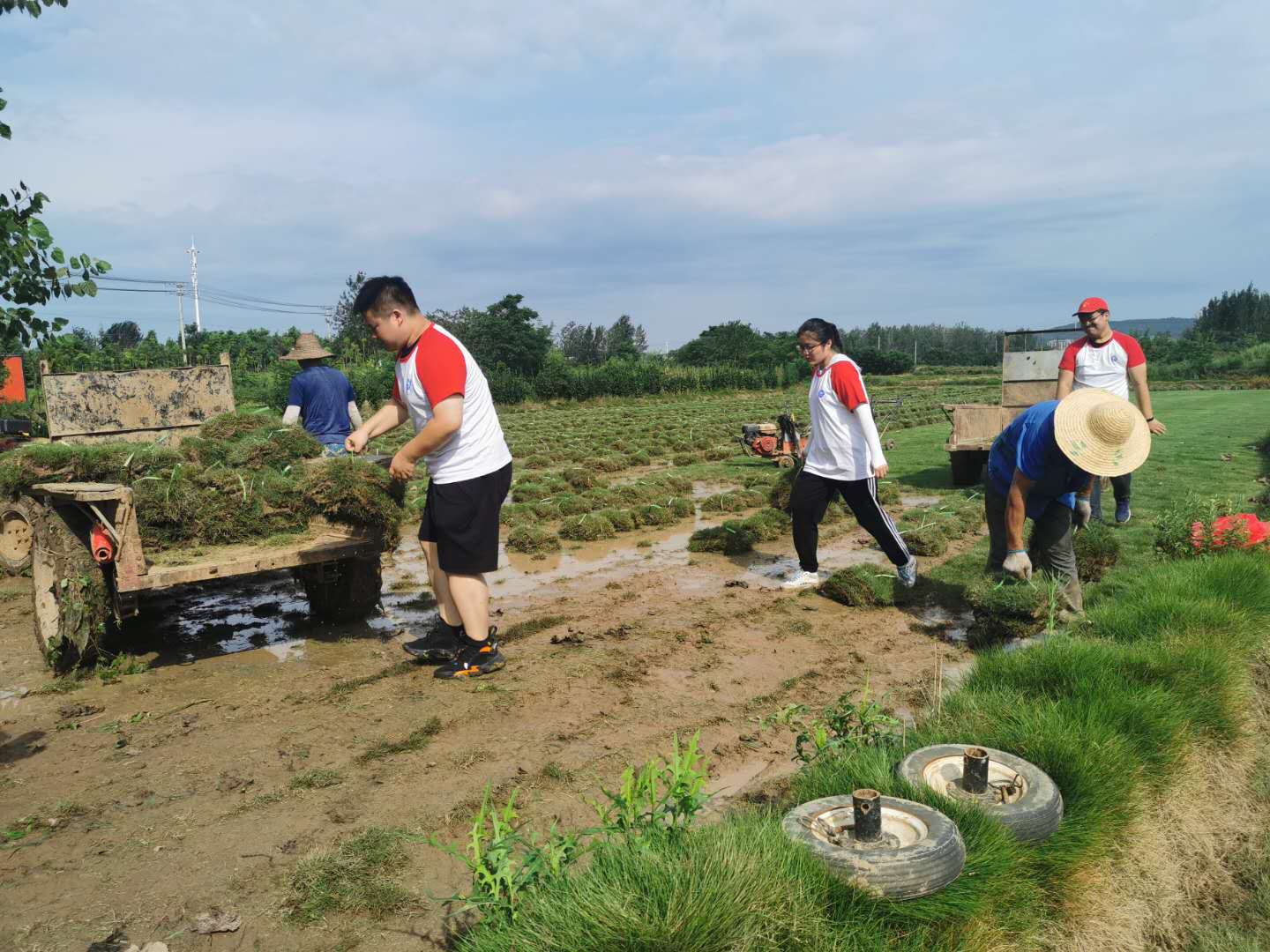 实践团成员在基地经理的带领下参观了草坪种植场,队员们围绕草坪生产中土壤变化情况及草农们草坪生产遇到的问题,对草农进行了采访咨询,并听取了草农分享的多年种殖经验和致富心得,帮助草农搬运草皮,在实践中体验劳动的辛勤与收获知识的快乐,将青春的汗水撒入美丽滁城。
