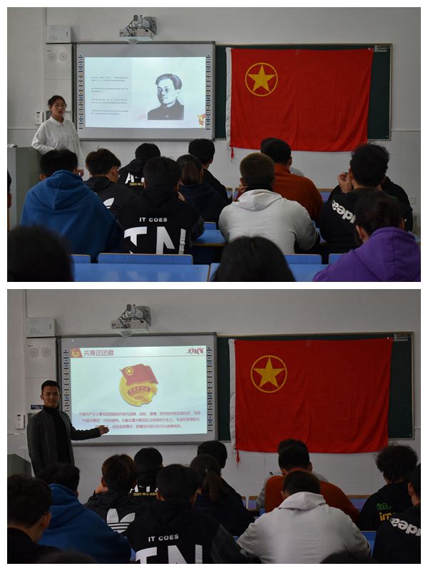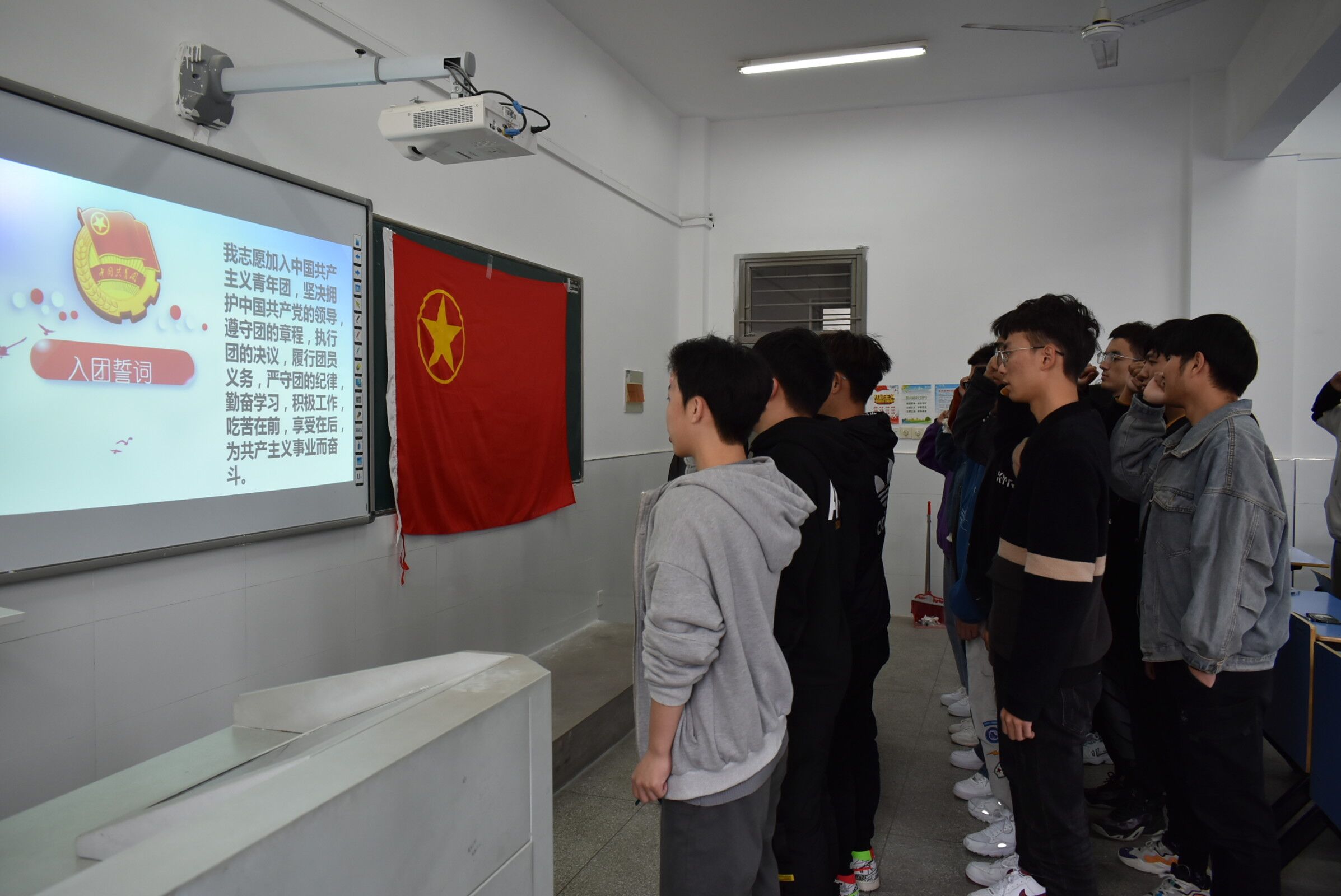 团总支指导老师李瑞瑞做动员讲话,希望所有新团员珍惜入团机会,时时处处用共青团员的标准严格要求自己,积极开展网上主题团课大学习,并在今后的学习和生活中起模范带头作用。19级团支书分别向新团员介绍了中国共青团的光辉历史、《中国共青团章程》,早期共青团历史人物介绍,以及身为团组织成员的标准和应具备的素质,强化团员意识,争做四有青年。并就入团志愿书的填写要求做详细讲解。最后,全体团员面向团旗庄严宣誓。