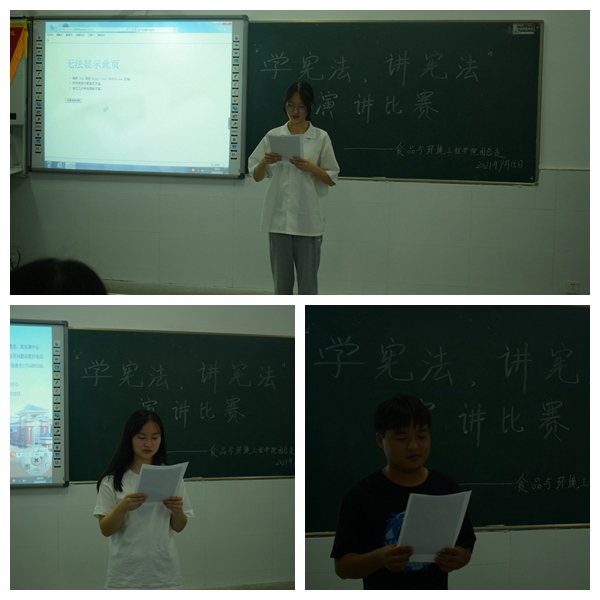 为了弘扬宪法精神,增强同学们的宪法意识,提高同学们学习宪法的积极性,食环学院团总支、学生会于9月15日晚在致善楼2302共同开展了“学宪法讲宪法”演讲比赛。
