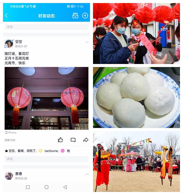 “增知识,长见闻”——同学们通过查阅资料了解元宵节的来历、变迁、各种习俗以及背后蕴含的深刻文化背景和寓意,分享自己对元宵节的独特见解。“我实践,我奉献”——21园林工程的刘许诺同学参加了家乡大溪河镇的“关爱留守儿童闹元宵猜灯谜”活动,为留守儿童送上爱心和祝福;21化工的陈星同学参加了家乡社区的陪伴留守儿童、包元宵活动,并为环卫工人送上热腾腾的汤圆。“庆元宵,我来晒”——同学们纷纷上传了自己庆祝元宵节的图片,赏花灯、吃汤圆、猜灯谜等活动,记录了自己专属的元宵节。