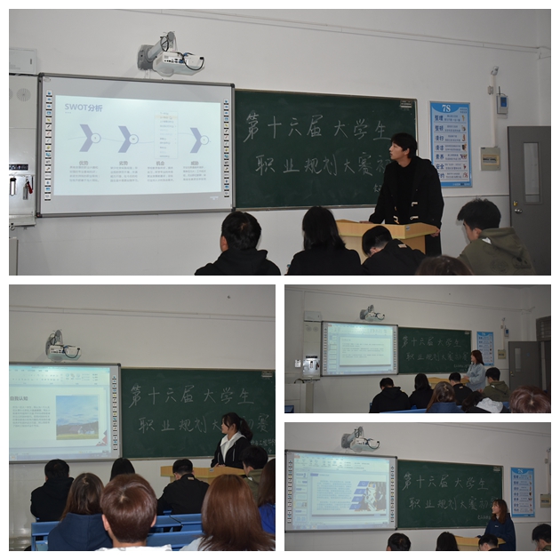 比赛现场,选手们结合自身特点对自身学习与发展进行合理规划,他们以PPT演示的形式从自我认知、职业环境分析、职业目标确定、评估与调整等方面现场展示自己的职业规划。选手们在演讲中放飞梦想、畅谈未来,透漏出他们对美好未来的憧憬和希望。两位老师在肯定选手们优点的同时,从现场演讲、仪容仪表、PPT内容等方面进行了全面点评,并针对选手的实际情况提出了合理的建议。