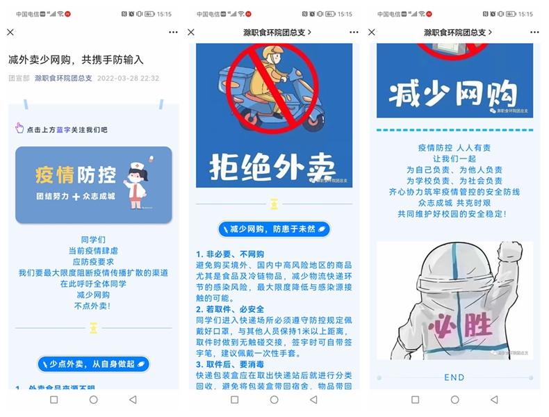 团总支积极在微信公众号发出“减外卖少网购,共携手防输入”的倡议;各班级在QQ群、微信群等网络平台发出“我承诺!减少外卖网购,助力校园抗疫”的线上接力承诺。